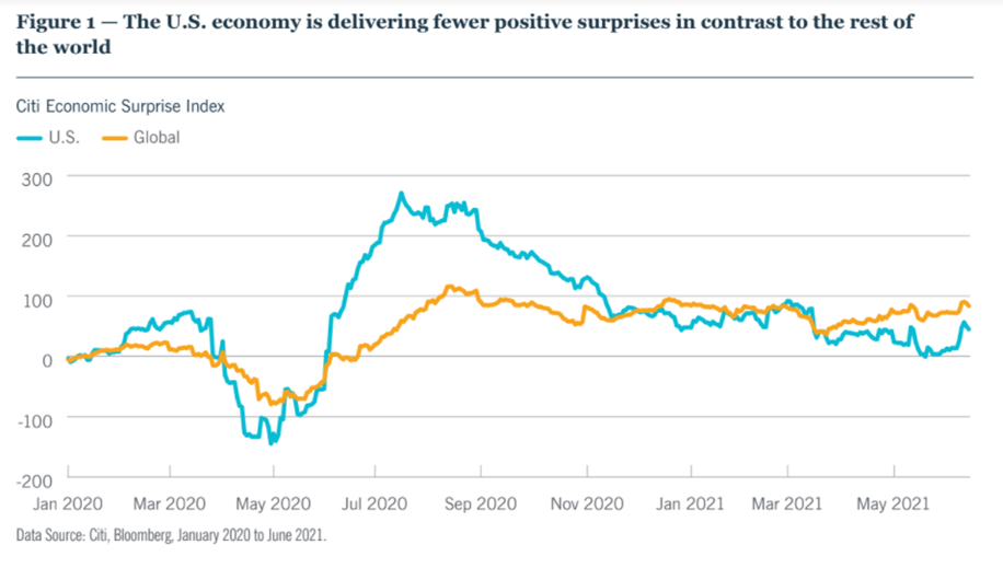 All’inizio dell’anno nel nostro outlook per il 2021 avevamo previsto una luce intensa in fondo a un tunnel buio. Dopo sei mesi, abbiamo quasi attraversato quel tunnel e la luce è già più intensa di quanto ci aspettassimo. L’ipotesi al rialzo dell’inizio di quest’anno è diventata lo scenario di base: l’economia globale è in piena espansione e i casi di COVID-19 si stanno riducendo in modo deciso. I mercati finanziari hanno incorporato questa notizia sorprendente e gradita nelle loro valutazioni in modo (per lo più) ordinato e a beneficiarne sono stai gli investitori con un portafoglio diversificato. Ma se la ripresa globale è in anticipo sulle previsioni, le aspettative per gli Stati Uniti, in particolare, sono già in linea con la realtà (grafico 1). Cosa succederà adesso che la maggiore economia mondiale ha perso la sua capacità di sorprenderci?