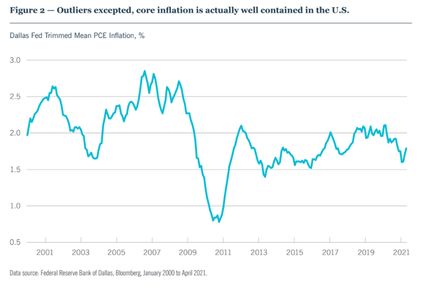 Il mondo sta vivendo una ripresa economica dalla pandemia relativamente veloce e sembra indirizzato verso una solida crescita nel 2022 e la maggior parte degli investitori ha identificato nell’inflazione statunitense il prossimo serio rischio all’orizzonte. I dati mensili dell’inflazione negli Stati Uniti per aprile e maggio hanno confermato le loro preoccupazioni. Ma se il doppio shock per la domanda, rappresentato dallo stimolo fiscale e dalla riapertura post-pandemica, ha creato forti pressioni sui prezzi per alcuni settori, nell’ultimo anno l’inflazione per la maggior parte di beni e servizi è aumentata solo moderatamente (grafico 2).