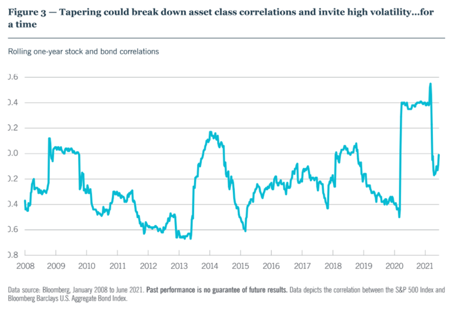 Raramente la storia si ripete, ma spesso ci sono delle assonanze. Gli inasprimenti monetari degli ultimi tempi — compreso il famigerato “taper tantrum” del 2013, verificatosi l’ultima volta che la Fed ha ridimensionato gli acquisti di asset — sono stati una prova impegnativa per gli investitori con portafogli diversificati, dal momento che le correlazioni tra azioni e obbligazioni sono diventate positive, mentre i loro prezzi sono scesi in contemporanea (grafico 3).