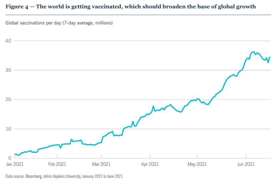 Il ritmo delle vaccinazioni potrebbe già aver raggiunto il picco negli Stati Uniti, ma sta continuando ad aumentare in modo deciso nel resto del mondo (grafico 4). Questo ci suggerisce che lo slancio economico si sposterà dagli Stati Uniti al resto del mondo. Ma quali implicazioni, se ce ne sono, avrà tutto ciò per i mercati finanziari?