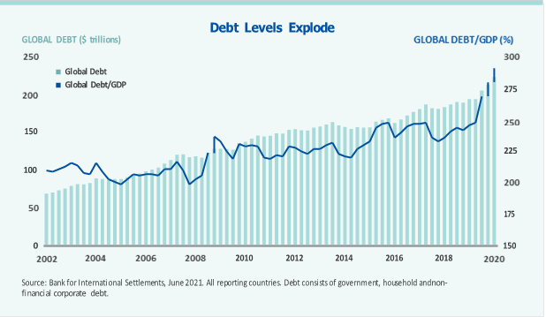 Dati di recente pubblicazione mostrano che il debito mondiale è cresciuto del 15% lo scorso anno, a un livello record di 221 mila miliardi di dollari, o il 290% del Pil mondiale. La maggior parte dell’aumento di 28 mila miliardi di dollari è stato causato dal debito sovrano balzato del 25%.