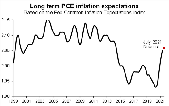 Sia i mercati finanziari che le famiglie stanno infatti diventando più fiduciosi nella natura temporanea dell’alta inflazione, rivedendo al ribasso le aspettative a lungo termine. L’indicatore delle aspettative di inflazione introdotto dalla Fed è tornato nel secondo trimestre ai livelli del 2014 (poco sotto il 2,1%). La nostra previsione per il terzo trimestre 2021 indica un ulteriore, ma molto più contenuto, aumento.
