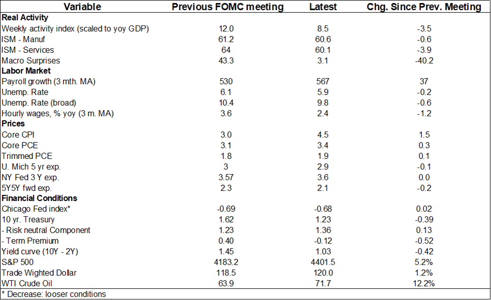 Come nelle precedenti riunioni, il presidente Powell ha osservato che i “sostanziali ulteriori progressi” nel mercato del lavoro che la Fed deve registrare prima di ridurre lo stimolo non sono stati ancora raggiunti. L’ampio scollamento tra l’elevata disoccupazione e il boom dell’offerte di impiego è dovuto al fatto che una quota elevata di disoccupati sta assumendo un nuovo lavoro piuttosto che tornare al precedente, e questo crea limiti alla velocità delle assunzioni. Inoltre, i freni legati alla paura residua del COVID, alla chiusura delle scuole e ai generosi sussidi per l’occupazione stanno svanendo. Il FOMC prevede una forte ripresa del mercato del lavoro nei prossimi mesi, ma c’è ancora lavoro da fare. Il nostro indicatore, che considera il comportamento aggregato del mercato del lavoro e i differenziali di performance tra i gruppi, mostra un gap ancora sostanziale rispetto alla situazione pre-pandemia.