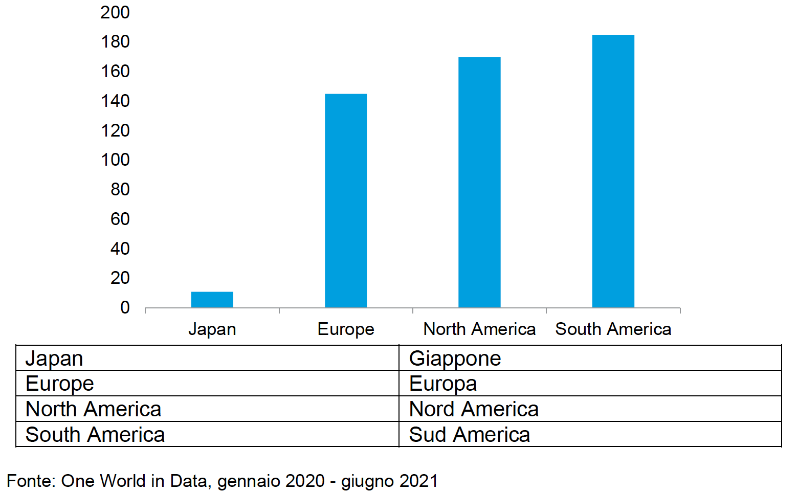 Dal punto di vista del Covid, il Giappone ha uno dei tassi di mortalità più contenuti del mondo. Come mostra la Figura 1, i tassi di mortalità giapponesi sono nettamente più bassi rispetto ad altre regioni, a dimostrazione della sua efficace gestione della pandemia. In effetti, il numero totale di morti in Giappone nel 2020 è stato inferiore a quello del 2019, il che testimonia le efficaci misure di contenimento adottate dal paese.