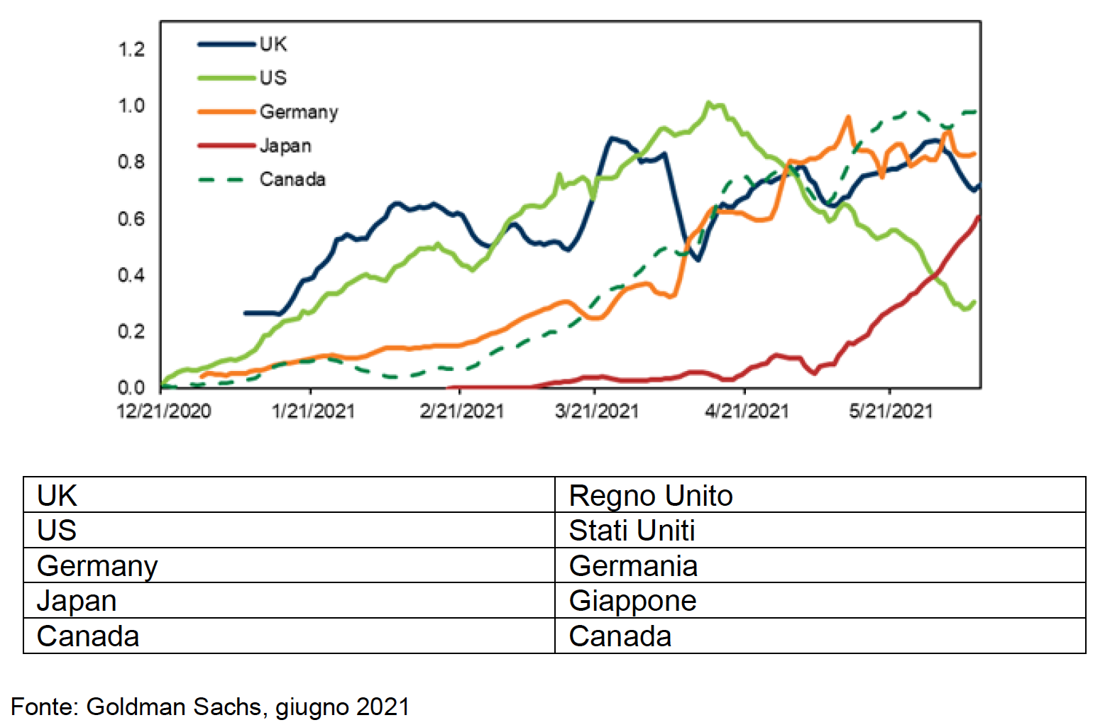 Anche a causa di questo successo, il ritmo delle vaccinazioni in Giappone è stato più lento di quello di altri grandi paesi, ma ha iniziato ad aumentare considerevolmente a maggio (Figura 2).