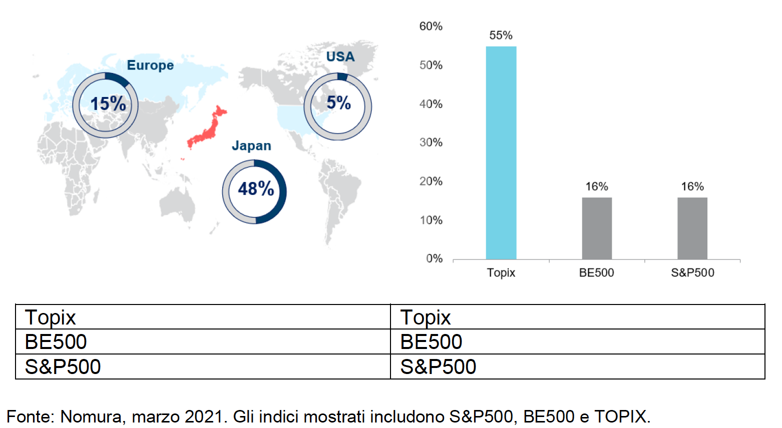 Nel 2021 i profitti delle imprese giapponesi dovrebbero crescere del 25% circa su base annua, mentre le valutazioni rimangono appetibili. Circa la metà delle aziende nipponiche incluse nel Tokyo Stock Exchange Index scambia al di sotto del valore contabile, e metà delle società non finanziarie – una quota molto più alta rispetto ai mercati statunitensi ed europei – presenta una posizione di liquidità netta. Pertanto, il Giappone è chiaramente uno dei mercati azionari con le valutazioni più interessanti a livello globale.