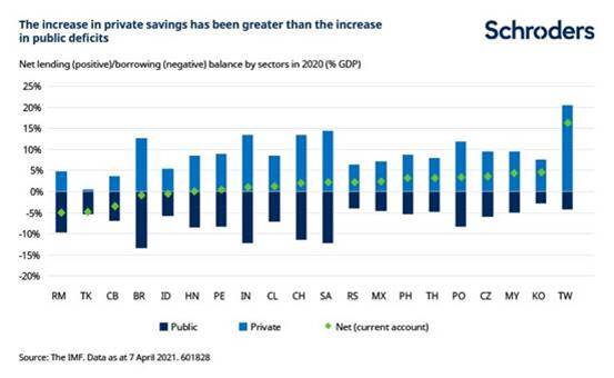 Con la spesa pubblica in forte aumento durante la pandemia, sembrerebbe che i risparmi siano diminuiti ulteriormente. Tuttavia, un aspetto positivo è che i risparmi privati, nella maggior parte dei casi, sono aumentati anche più dei deficit pubblici. Le partite correnti delle economie emergenti, che riflettono l’equilibrio aggregato tra risparmi e investimenti, sono infatti migliorate notevolmente dall’inizio della pandemia.