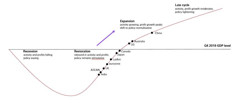 Il PIL ha pienamente raggiunto i livelli pre-Covid negli Stati Uniti, in Cina e in tutta l’Asia industriale. I ricavi delle imprese hanno registrato un rimbalzo a forma di V e le attese per il 2022 sono superiori a quelle pre-pandemia. Se da un lato le pressioni sull’inflazione sono in aumento, dall’altro il dibattito politico si è spostato sul programma di tapering del QE e sulle tempistica del lancio di nuove politiche, suggerendo che stiamo entrando in una fase di espansione di metà ciclo economico.