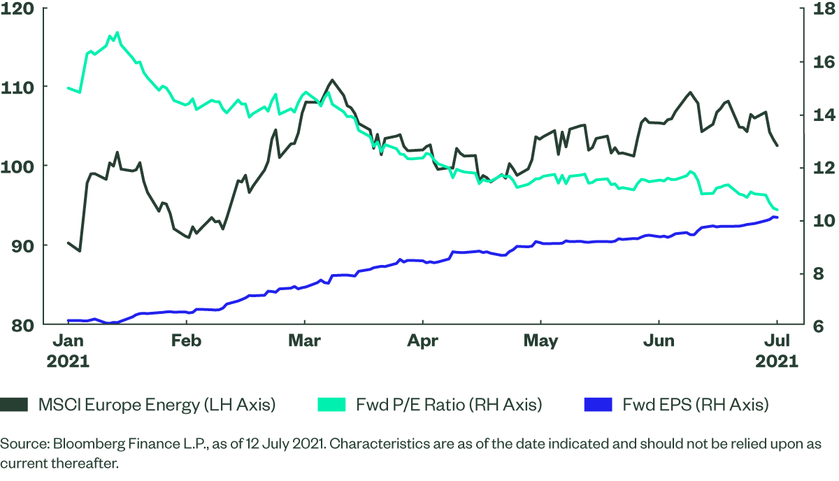 Nella prima metà del 2021, il settore energetico statunitense ha prodotto una performance pari al 42%* (con gli indici MSCI World Energy e MSCI Europe Energy in crescita rispettivamente del 30% e del 17%) grazie al miglioramento delle prospettive per i prodotti petroliferi e del gas e alla capacità di trasferire i prezzi più elevati delle materie prime. L’andamento dei prezzi, degli utili e del P/E per il settore in Europa è evidente dalla figura 1 qui sotto.