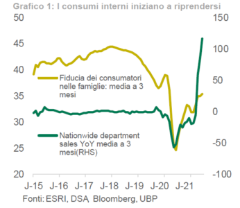 Ciò dovrebbe fornire un vento di coda al consumo interno nella seconda metà del 2021, ma il sentiment dei consumatori giapponesi rimane debole. La fiducia dei consumatori è migliorata dal minimo del giugno 2020, ma è molto al di sotto dei livelli pre-COVID (grafico 1). L’ultima estensione dello stato di emergenza probabilmente smorzerà ulteriormente il sentiment dei consumatori, ritardando la ripresa dei consumi. Prima dell’ultima ondata di coronavirus, il reparto vendite a livello nazionale era aumentato al 37,4% anno su anno a giugno. Certamente, esse sono state sostenute da un forte effetto base favorevole, ma indicano anche una propensione latente al consumo dopo molti mesi di stato di emergenza. Di conseguenza, prevediamo che i consumi interni si riprenderanno, pur gradualmente, nel resto del 2021.