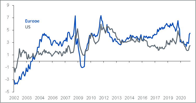 I mercati azionari globali, guidati dall’Europa e dagli Stati Uniti, continuano a postare nuovi massimi, sostenuti da utili più robusti. Come si evince dal grafico qui sotto, i premi al rischio azionario in Europa sono saliti ai massimi sui 15 mesi del 4,5%, il che continua a suggerire che l’equity europeo rimane interessante rispetto alle obbligazioni e ad altri mercati azionari globali.