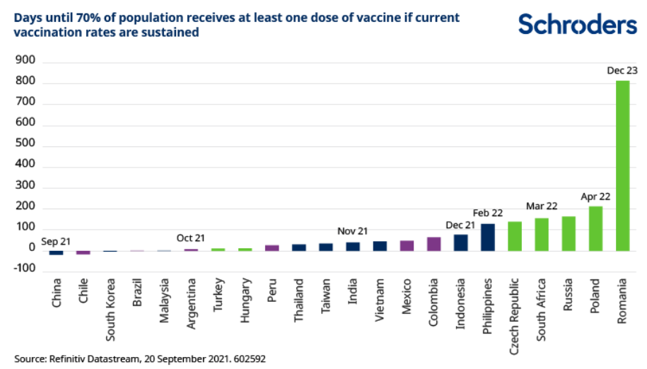 Dopo alcuni progressi positivi all’inizio delle campagne vaccinali, le somministrazioni sono andate in stallo in molti Paesi, tanto che ai tassi attuali la maggioranza delle popolazioni non sarà vaccinata prima della metà dell’anno prossimo. Con l’inverno che si avvicina nell’emisfero settentrionale, queste economie sono dunque le più vulnerabili a disagi causati dal Covid che potrebbero provocare una sottoperformance degli asset.