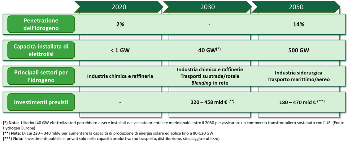 La Strategia Europea per l’idrogeno, rilasciata dalla Comunità Europea nel luglio 2020, vuole essere uno dei cardini della completa decarbonizzazione dell’economia e del raggiungimento degli obiettivi di neutralità climatica al 2050: entro il 2030 si prevede di investire tra i 320 e i 458 miliardi di euro, di cui 220-340 miliardi per aumentare la produzione di energia fotovoltaica ed eolica necessaria all’idrogeno verde, e di installare 40 GW di capacità di elettrolizzatori (attualmente siamo a meno di 1) più altri 40 GW nel vicino medio-oriente, così da raggiungere nel 2050 i 500 GW di capacità installata. L’utilizzo dell’idrogeno nei consumi finali dovrebbe passare dall’attuale 2% fino al 14%, coinvolgendo non solo l’industria chimica e di raffinazione, ma anche quella siderurgica, il trasporto pesante via terra, marittimo e aereo, il riscaldamento urbano e industriale. Tuttavia, ad oggi permangono una serie di importanti ostacoli, alcuni generati dalla stessa normativa europea: i vincoli posti dalla RED II sulle emissioni di CO2 consentite per l’idrogeno pulito, ad esempio, non permettono l’adozione dell’idrogeno blu, in attesa di adottare il più ecologico idrogeno verde.