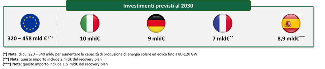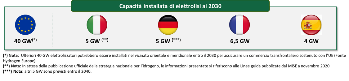 La Strategia Europea è stata seguita da quelle dei principali Paesi membri, tra cui Germania, Francia e Spagna. In Italia, invece, al momento sono disponibili solo le Linee guida della strategia italiana per l’idrogeno emesse dal Ministero dello Sviluppo economico lo scorso novembre, che fissano l’obiettivo di 5 GW di capacità di elettrolizzatori nel 2030 e indicano investimenti per circa 10 miliardi, di cui 5-7 per la produzione di H2 (ma non per lo sviluppo di impianti di rinnovabili alla base del processo per l’idrogeno verde), 2-3 per la realizzazione di infrastrutture e 1 per la ricerca. Cifre non dissimili da quelle di Germania, Francia e Spagna.