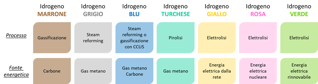 Attualmente, quasi tutte le molecole di idrogeno prodotte hanno un forte e negativo impatto sull’ambiente: il 99,3% delle circa 73 Mton H2 complessive, infatti, deriva dal trattamento a vapore del metano (Steam Methane Reforming, SMR) o da gassificazione del carbone (idrogeno grigio o marrone) e immette in atmosfera circa 9-10 tonCO2/tonH2 nel primo caso o peggio 18-20 tonCO2/tonH2 nel secondo. L’idrogeno così prodotto alimenta l’industria chimica e di raffinazione e comporta costi bassi, rispettivamente 1-2 $/kgH2 per lo SMR e 1-1,5 $/kgH2 per la gassificazione. Il tema centrale sta tutto qui: come produrre idrogeno non solo per questi settori, ma anche per il trasporto pesante, il riscaldamento urbano o la decarbonizzazione di altri processi industriali, ad esempio la siderurgia, a costi competitivi con gli attuali ma senza emissioni di CO2 in atmosfera. I due processi coinvolti oggi in questa sfida riguardano la produzione di idrogeno blu e quella di idrogeno verde, in base ai colori definiti per distinguerli partendo dalla fonte energetica utilizzata e dalle relative emissioni di CO2 in atmosfera.