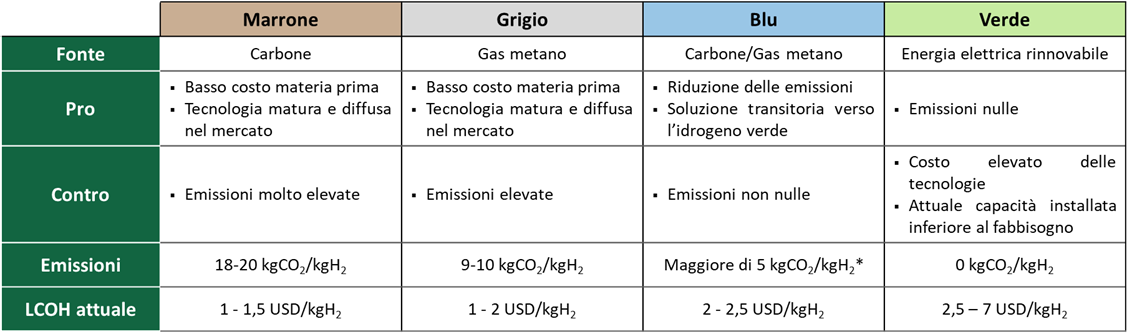 L’idrogeno è l’elemento chimico più diffuso nell’Universo e sulla Terra, ma quando se ne parla nel contesto energetico si intende in realtà la molecola di idrogeno H2, assai rara in atmosfera e in grado di produrre energia (termica mediante combustione o elettrica mediante elettrolisi) in maniera pulita senza emissione di anidride carbonica. Tuttavia, essendo rara, tale molecola va prodotta e questo consuma a sua volta energia: il bilancio tra le emissioni di CO2 durante la produzione e i costi complessivi di generazione, trasporto e stoccaggio è alla base dell’intero ruolo dell’idrogeno nella transizione energetica. Oggi, infatti, la quasi totalità dell’idrogeno prodotto (marrone o grigio) ha un forte e negativo impatto sull’ambiente ma costa poco: soltanto lo 0,7% è idrogeno blu o, meglio ancora, verde, derivati da processi assai più costosi ma poco o per nulla inquinanti.