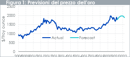 Il nostro quadro modello riesce a fornire una prospettiva sui prezzi dell’oro fino al secondo trimestre 2022 comprendente un consensus sui dati macroeconomici utilizzati.