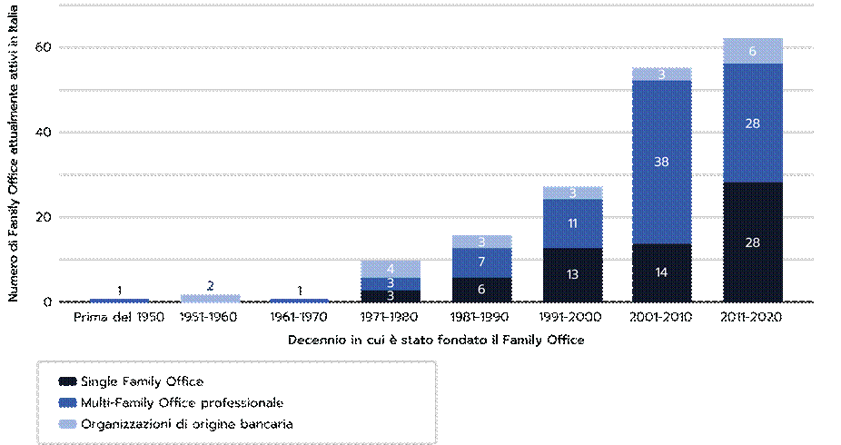 Il fenomeno dei Family Office in Italia ha registrato un’evidente accelerazione dal 2000. Si pensi che più di 100 dei 169 Family Office attivi in Italia (oltre ai 9 che operano all’estero) sono stati fondati nell’ultimo ventennio, 61 solo dal 2011. Oltre il 64% di essi ha sede in Lombardia, il 12% in Veneto e il 9% in Piemonte, seguono il Lazio (5,9%) e l’Emilia Romagna (4,7%). Le forme societarie adottate sono principalmente due, Società a responsabilità limitata (57%) eSocietà per azioni (40%). La popolazione censita include sia Family Office costituiti ex novo, siaorganizzazioni fondate nel passato (14 sono nate prima del 1981) che sono divenute FamilyOffice tramite l’ampliamento progressivo del portafoglio di attività e competenze.