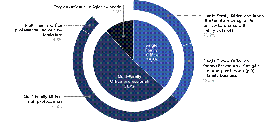 La tipologia più “tradizionale” è il Single Family Office (37% del totale), struttura controllata da una sola famiglia che è anche la destinataria delle attività e che nel 52,2% dei casi detiene ancora un’impresa; il 28,5% dei Single Family Office si rapporta con il Consiglio di famiglia e il 57,9% è multigenerazionale, cioè di proprietà di due o più generazioni di imprenditori. La forma più diffusa però (51,7%) è il Multi-Family Office professionale, struttura formalmente indipendente, aperta al mercato, che raggruppa professionisti per servizi di consulenza e gestione del patrimonio a più famiglie (8 sono l’evoluzione di Single Family Office che hanno aumentato la base clienti). Infine, ci sono le organizzazioni di origine bancaria (11,8%) che offrono soluzioni di private banking evoluto e/o di wealth management così personalizzati da risultare simili a quelle dei Multi-Family Office.