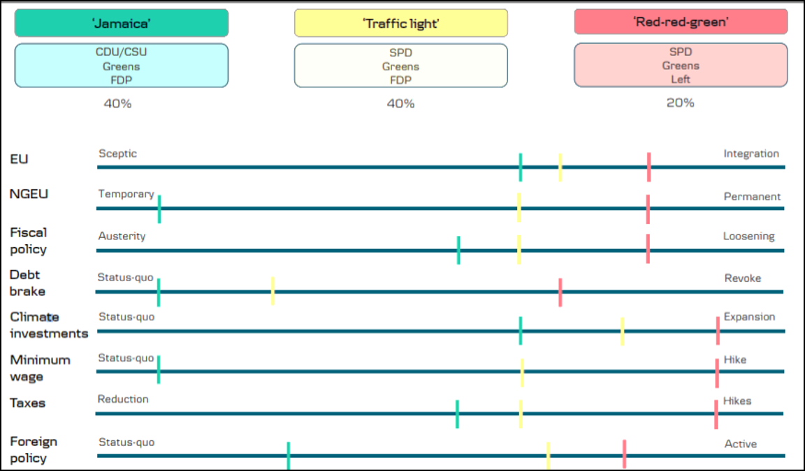 Emerge, quindi, la possibilità concreta di una coalizione priva del CDU, formata da SPD, Verdi e Liberali, che segnerebbe la fine di un’epoca di grande stabilità politica nel Paese. In aggiunta, soprattutto qualora il governo dovesse finire per inglobare la sinistra al posto dei Liberali, potremmo assistere a una maggiore spesa fiscale in Germania, in parte con la veste di spesa per la tutela dell’ambiente (si veda la Fig. 5). Quindi, per quanto la gestione disciplinata delle finanze pubbliche sia trasversale a tutti gli schieramenti politici del Paese, le elezioni potrebbero dare un esito capace di allentare leggermente le briglie del controllo rigido della spesa, in Germania ma anche all’interno dell’Unione Europea. Un ritorno più morbido alle regole di bilancio (Patto di Stabilità) e una ripresa del percorso di integrazione (unione bancaria, del mercato dei capitali, etc.) non sarebbero infatti da escludere, con risvolti potenzialmente favorevoli per la periferia della regione. Le nuove regole fiscali, l’efficacia delle riforme nei Paesi beneficiari del Next Generation EU (Italia e Spagna) nonché proprio l’assetto geopolitico dell’UE/EMU saranno la vera posta in gioco dei prossimi anni; gli esiti delle prossime elezioni tedesche andranno valutati attentamente in riferimento a questi aspetti.
