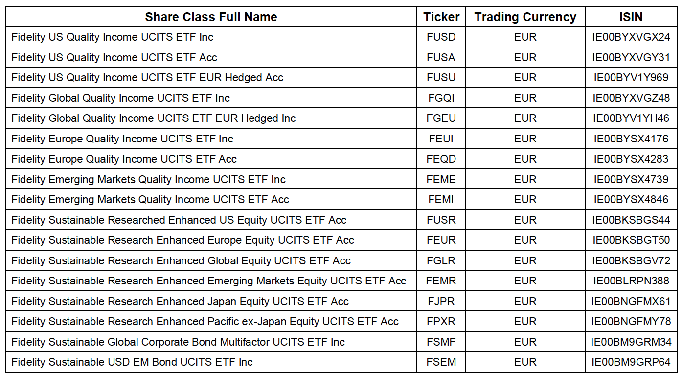 Nick King, Head of ETFs di Fidelity International, commenta: “Fidelity International offre soluzioni d’investimento a livello mondiale. I nostri prodotti ETF combinano la comprovata esperienza di Fidelity nell’analisi dei titoli, negli investimenti sostenibili e nella costruzione del portafoglio con l’efficienza di un veicolo ETF trasparente. Stiamo assistendo a una domanda significativa per questi prodotti e si prevede che questa continuerà ad accelerare poiché gli investitori cercano prodotti differenziati a prezzi competitivi. Sono lieto che ora tali prodotti siano disponibili su Borsa Italiana”.