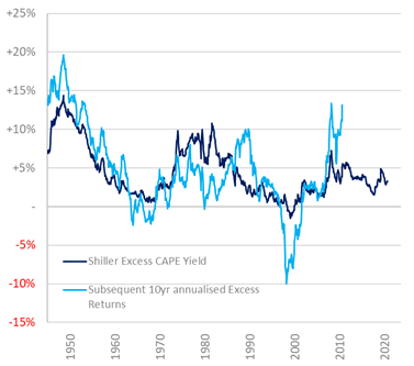 Mettendo insieme i dati azionari e obbligazionari, possiamo esaminare l’extra rendimento offerto da un rapporto CAPE inverso – ossia l’earnings yield corretto per il ciclo – rispetto ai Treasury USA. La relazione tra questo indicatore e i rendimenti totali sui 10 anni successivi, rappresentata nella Figura 3, appare più imprecisa di quella descritta nella Figura 1. Inoltre, non spiega alcune oscillazioni di entità pronunciata, come quelle registrate nel periodo compreso tra gli investimenti all’apice del boom delle dotcom e i disinvestimenti nel pieno della crisi finanziaria globale, o il boom successivo a quest’ultima che abbraccia gli anni compresi tra gli investimenti nel pieno della crisi e la liquidazione delle posizioni intorno al periodo attuale. Non credo tuttavia che si tratti di un modo irragionevole di analizzare l’impatto delle valutazioni su orizzonti d’investimento più lunghi. Osservati attraverso questa lente, gli extra rendimenti “promessi” dalle azioni rispetto alle obbligazioni appaiono da discreti a interessanti, anche se partendo da una base obbligazionaria ridotta in termini assoluti.