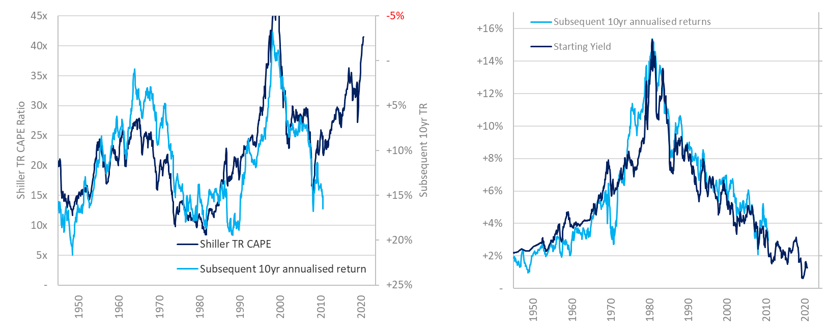 Figure 1 e 2: rapporto CAPE Total Return di Shiller vs. rendimenti totali annui; rendimenti cedolari dei Treasury USA a 10 anni vs. rendimenti totali annui