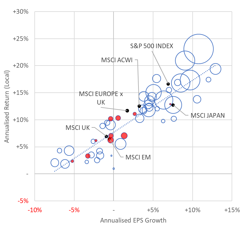 Ho evidenziato in rosso le bolle settoriali relative alle azioni britanniche per illustrare come queste ultime, pur avendo nettamente sottoperformato altri mercati nel periodo in esame, abbiano archiviato un risultato più o meno in linea con quanto ci saremmo potuti aspettare se avessimo avuto la capacità di prevedere perfettamente la traiettoria dei loro utili. Da questo inferisco che, per quanto le valutazioni iniziali siano importanti (nella misura in cui individuano euristicamente l’intercetta nel grafico), il tasso di crescita degli utili a medio termine esercita comunque un’influenza considerevole sui rendimenti azionari.