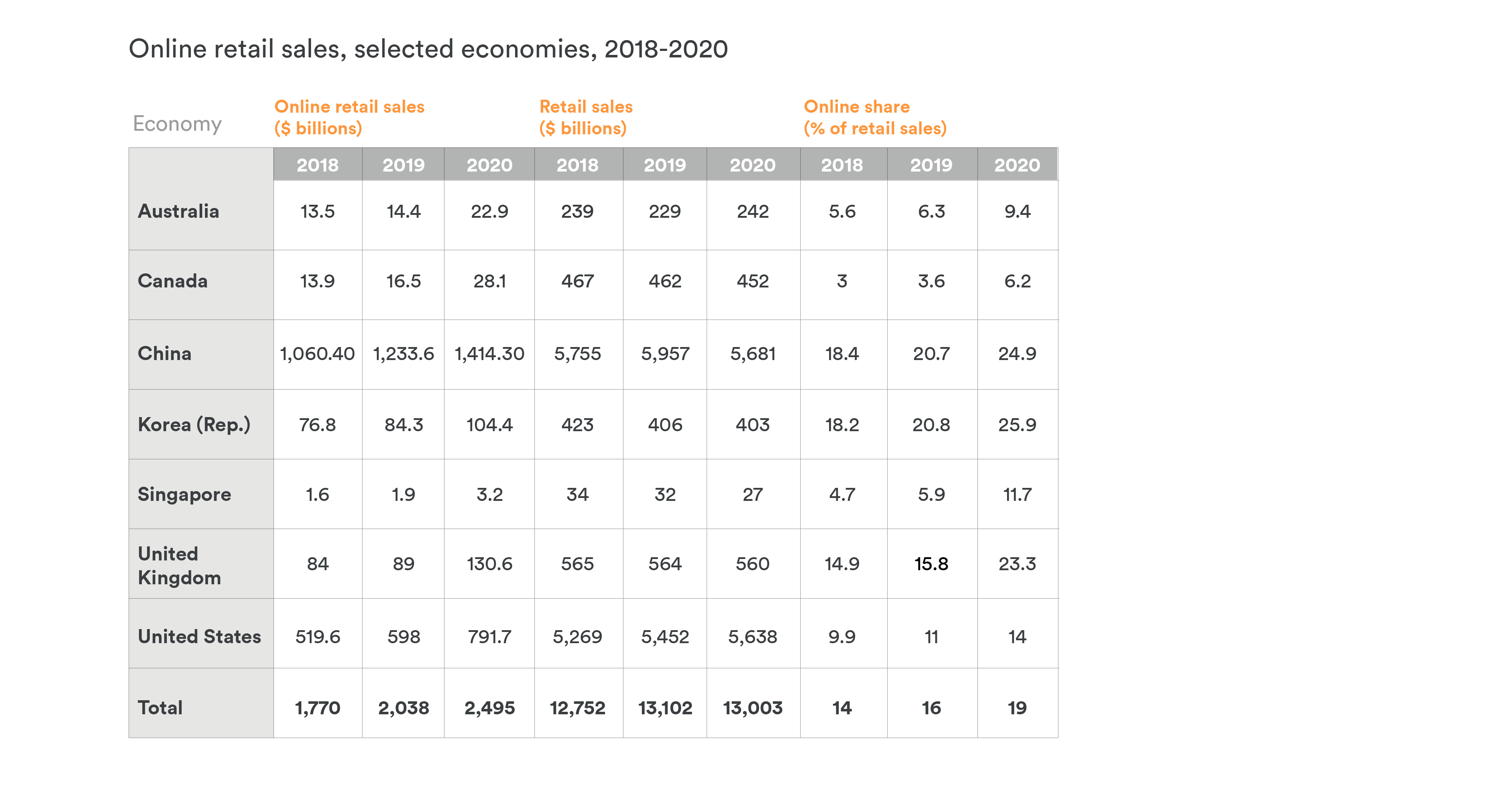 Negli ultimi anni, il settore della vendita al dettaglio online è cresciuto a passi da gigante. Secondo la Conferenza delle Nazioni Unite sul commercio e lo sviluppo (UNCTAD), nel 2019 solo sette paesi hanno rappresentato il 65% delle vendite globali al dettaglio online (o “B2C”). Nel 2020, queste nazioni hanno visto il 19% delle loro vendite al dettaglio effettuate online.