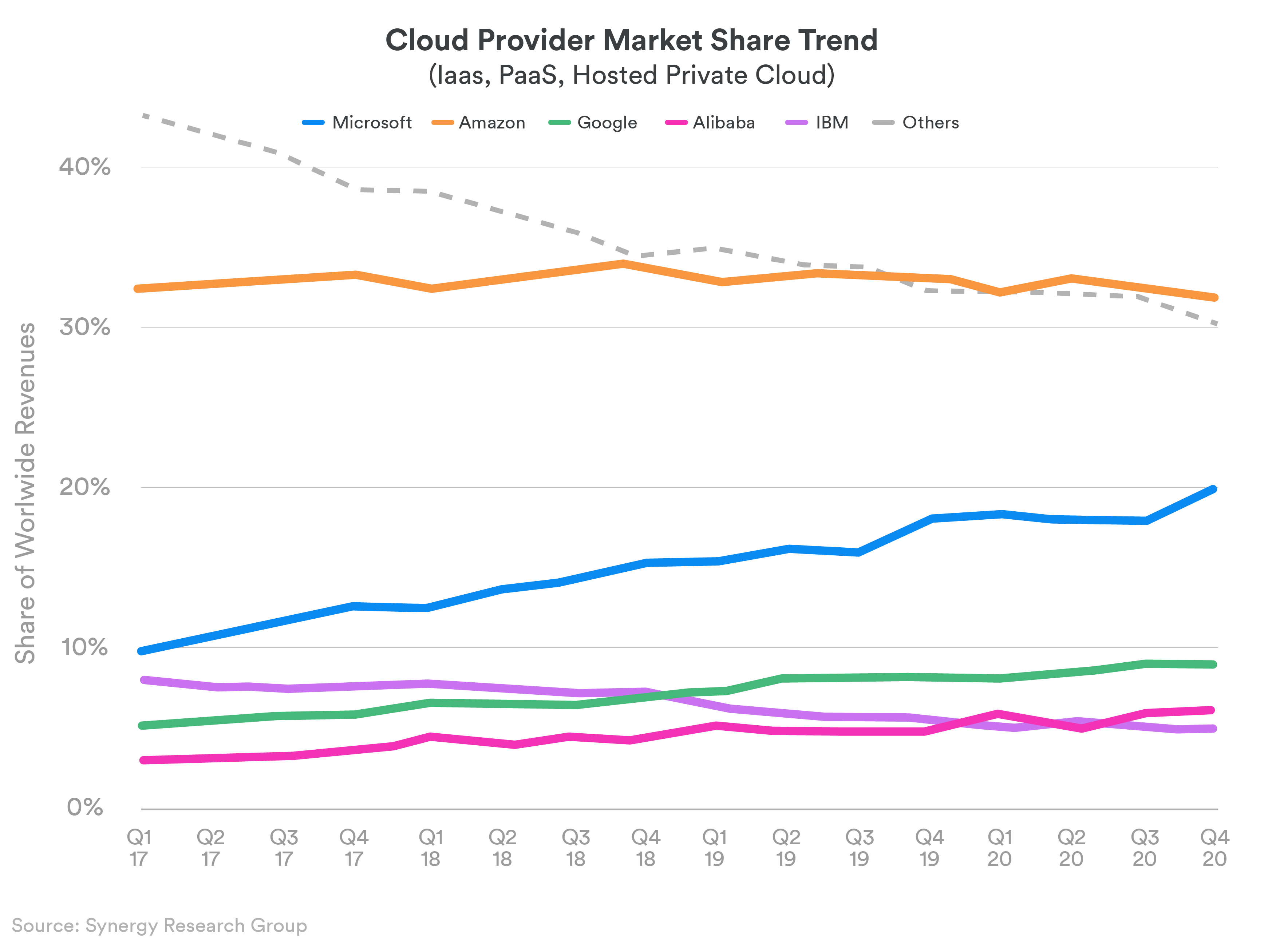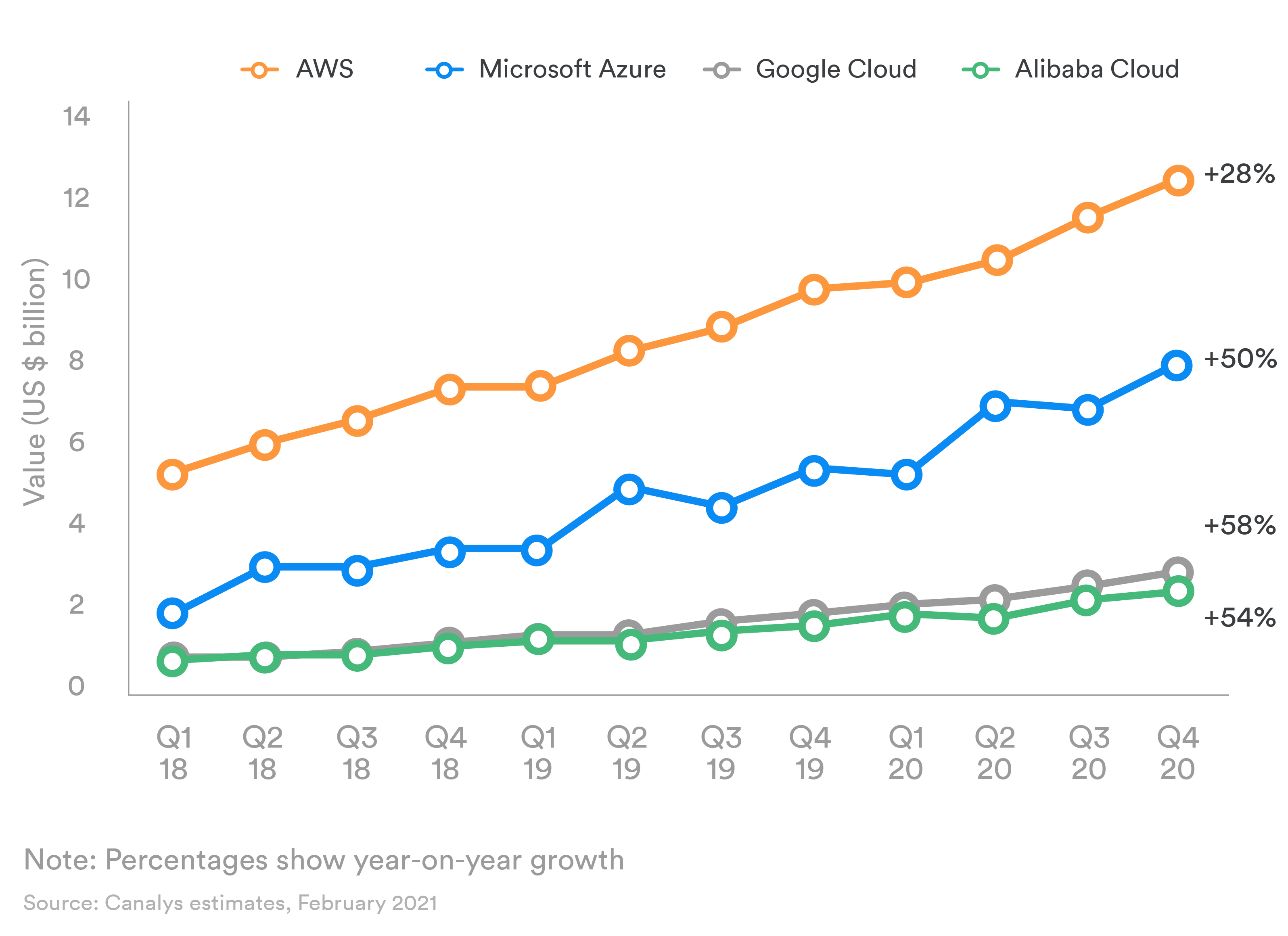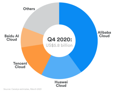 Mentre la battaglia per la quota di mercato del “cloud” mette Amazon in concorrenza con Microsoft, Google e IBM, anche il suo rivale cinese Alibaba sembra essere un serio contendente. Nel 2020, Alibaba Cloud ha evidenziato tassi di crescita paragonabili a quelli di Microsoft e Google, mentre quello di AWS rispetto a loro è quasi la metà.
