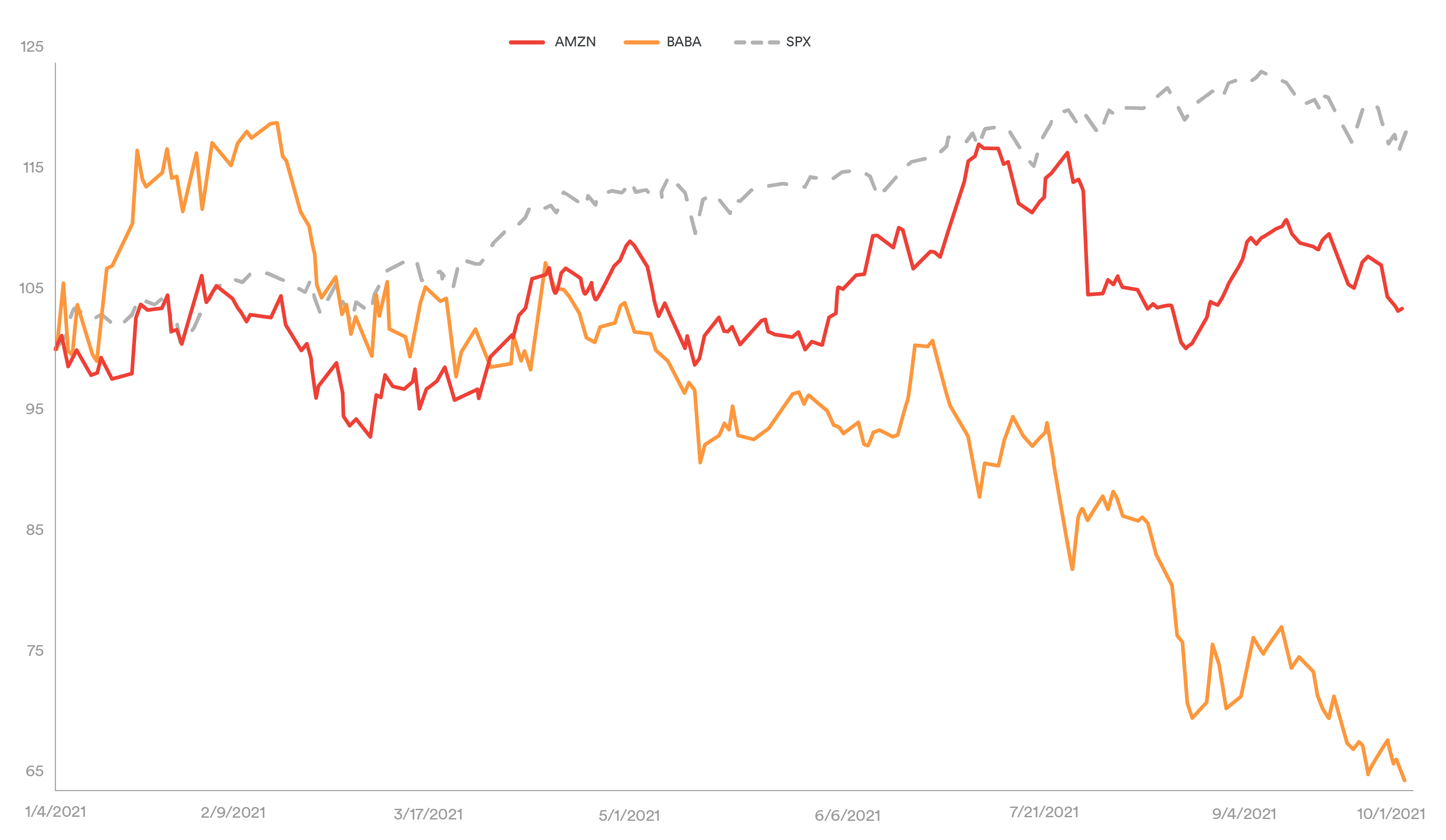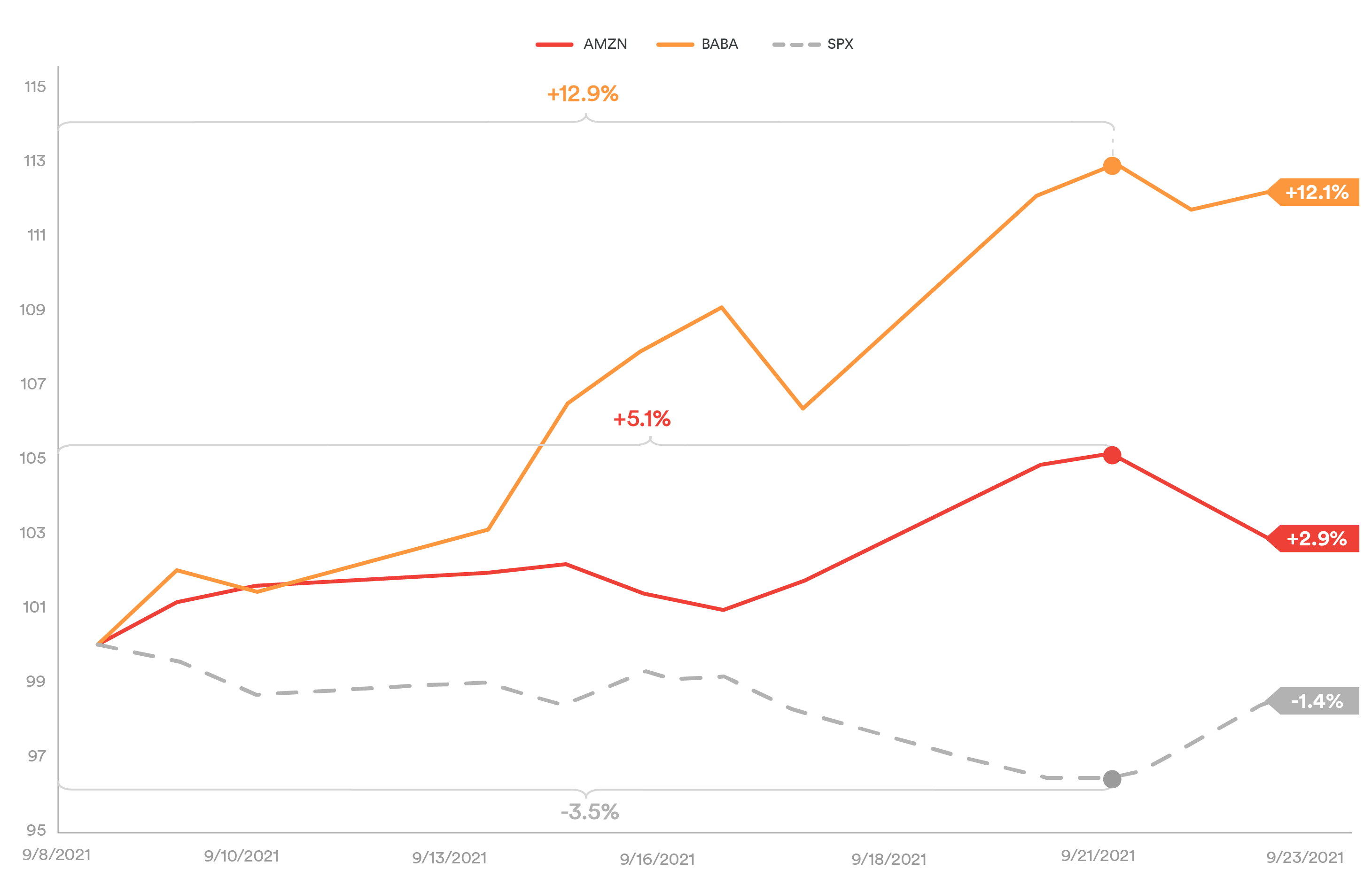 In termini di performance delle azioni nel 2021, Alibaba ha avuto un inizio spettacolare mentre Amazon è rimasta più silenziosa rispetto al benchmark S&P 500 (SPX). Ad oggi, comunque, sono entrambi dietro il benchmark in maniera considerevole.
