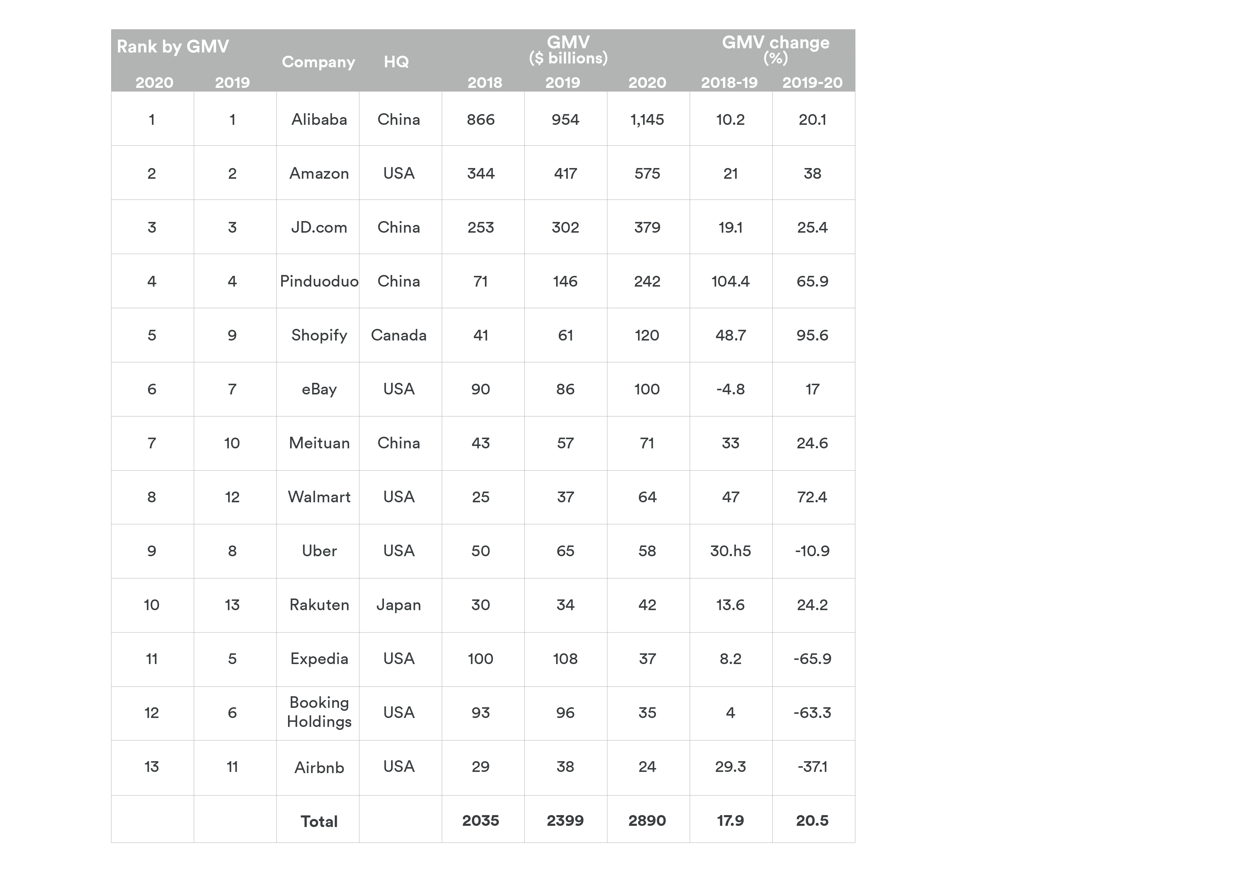 Nonostante la riduzione dei ricavi di alcune aziende B2C a causa della pandemia, il Total Gross Merchandise Value (GMV), ovvero il valore totale di beni e servizi forniti, per le prime 13 società di e-commerce B2C è aumentato del 20,5% nel 2020, con un valore totale di 2,9 trilioni di dollari.