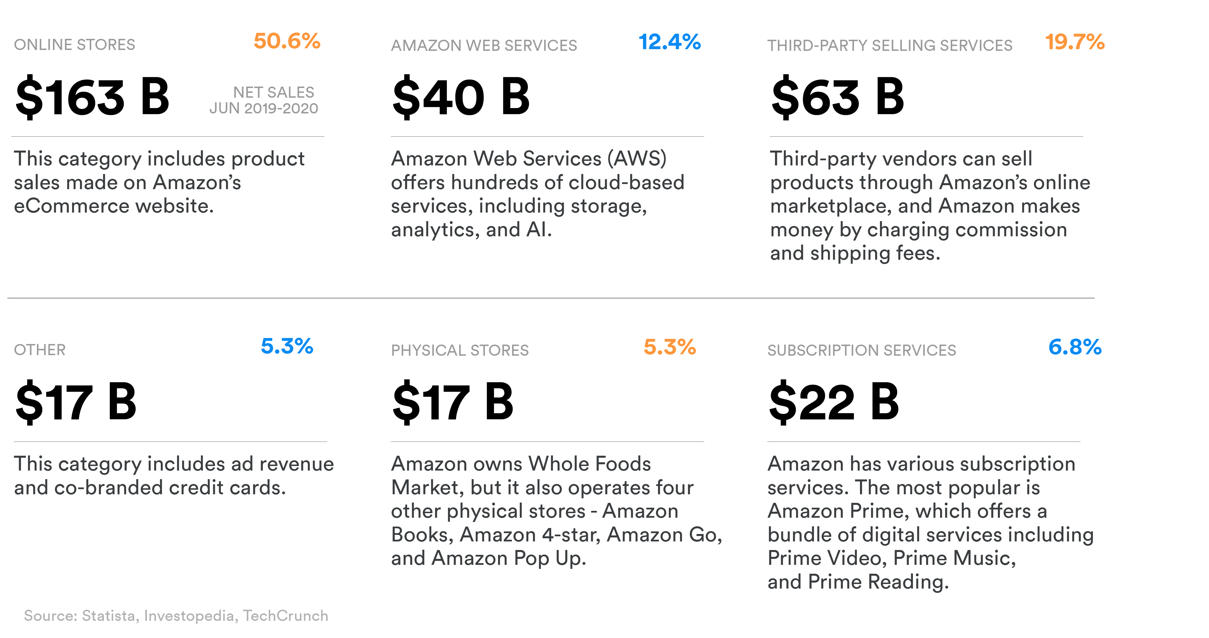 Come visto sopra, Amazon è un mostro nel mercato retail online. Guardando i dati relativi al periodo 2019-2020, la vendita al dettaglio online rappresenta oltre il 70% delle sue entrate.