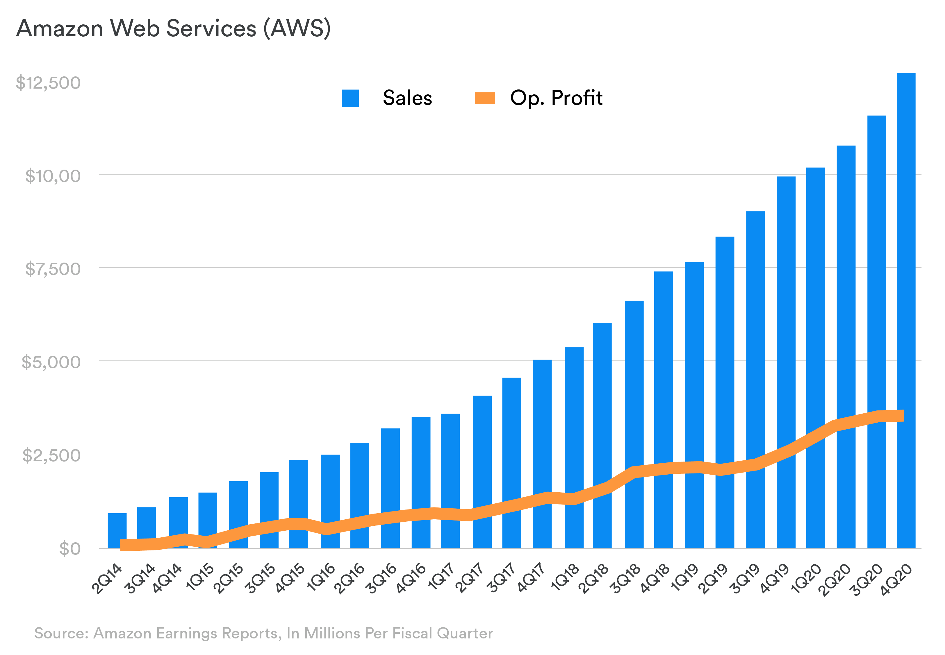 I rapporti sugli utili di Amazon rivelano che ad Amazon Web Services (AWS), che ha rappresentato un modesto 12,4% dei ricavi dell’azienda, si deve oltre il 63% dell’utile operativo dell’intera società – una cifra pari a 13,5 miliardi di dollari – per il 2020. Cresciuta e rafforzatasi sempre di più dal 2014, AWS è ora il principale driver dei profitti aziendali.