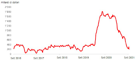 Quest’anno è seguita una riduzione altrettanto rapida. Tra febbraio e agosto 2021, il Tesoro USA ha di nuovo ridotto drasticamente la quantità di denaro. Il denaro è stato utilizzato per spese statali che altrimenti avrebbero dovuto essere finanziate con nuove obbligazioni. Questi 1’300 miliardi di USD disponibili hanno notevolmente ridotto il livello abituale di nuove emissioni di titoli di Stato statunitensi. Insieme al programma di acquisto della Banca centrale americana, ciò ha temporaneamente causato un’offerta ridotta di titoli di Stato USA. Questa è una delle ragioni principali del calo dei rendimenti dei Treasury nel secondo trimestre. Dato che i mercati globali dei tassi di interesse sono correlati in modo positivo ai tassi americani, si può supporre che questo meccanismo abbia esercitato una pressione sui mercati dei tassi in tutto il mondo.
