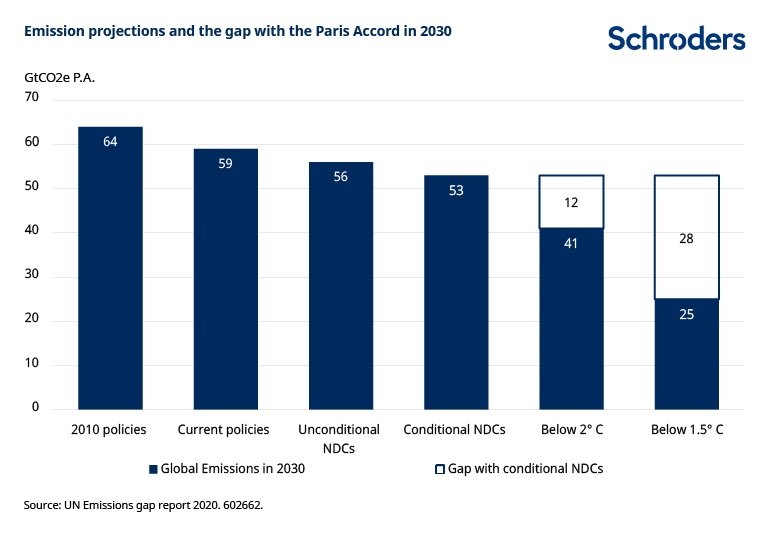 Secondo le stime ONU, anche se i contributi determinati a livello nazionale (nationally determined contributions – NDC) venissero implementati, le emissioni totali annue di gas serra ammonterebbero a 53 giga tonnellate nel 2030.