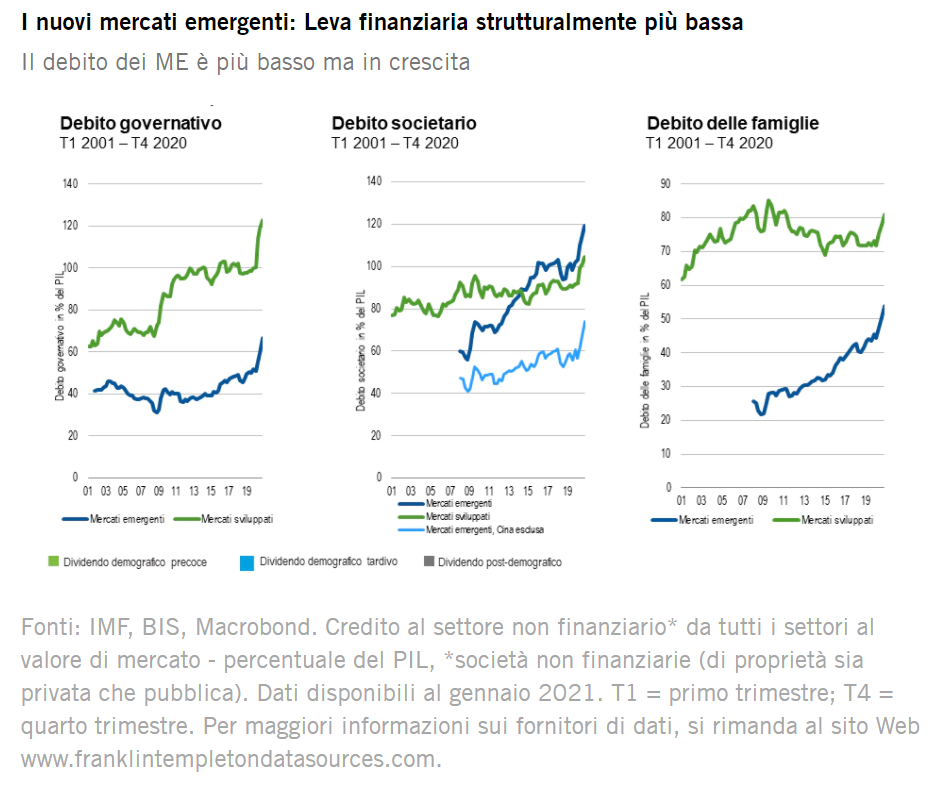 A parte un aumento in Cina, anche i livelli del debito societario nonché delle famiglie (consumatori) nei mercati emergenti sono ancora molto inferiori a quelli del mondo sviluppato. Riteniamo pertanto che i mercati emergenti dispongano di uno spazio molto maggiore per incrementare ulteriormente i livelli del debito senza provocare alcun impatto nocivo.