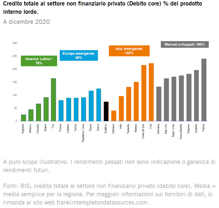 Tornando all’opportunità strutturale presentata da questo, i coefficienti del credito nell’America Latina e nell’Europa emergente sono molto più bassi, in percentuale del PIL, rispetto al mondo sviluppato e all’Asia emergente. È per questo motivo che America Latina ed Europa emergente sono apparsi interessanti a molti investitori, pur presentando alcuni elementi negativi. Il coefficiente debito-PIL vantato dal Messico, per esempio, è inferiore al 50% e mentre quello del Brasile è intorno al 100%, resta comunque molto inferiore a quello di numerosi paesi sviluppati. Vediamo una storia analoga nell’Europa dell’Est, dove in Turchia, Ungheria e Polonia, ad esempio, i livelli del debito sono più bassi rispetto a paesi quali Giappone, Australia, Francia, dove i coefficienti debito-PIL superano il 150%.