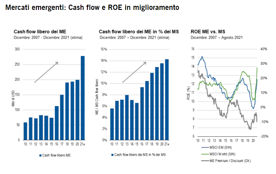 I cash flow sono un altro motivo per il nostro giudizio favorevole relativo ai mercati emergenti. Nell’ultimo decennio, i mercati emergenti hanno sottoperformato il mondo sviluppato in termini di redditività del capitale proprio. Nell’ultimo decennio tuttavia vi è stata una tendenza all’aumento dei cash flow liberi (in termini sia assoluti che relativi ai mercati sviluppati) che in quest’ultimo anno ha avuto un’accelerazione. Quest’anno le società dei mercati emergenti stanno generando un cash flow libero molto maggiore, a seguito del buon andamento delle società orientate alle materie prime e alla tecnologia (soprattutto nel settore dei semiconduttori). Con l’aumento del cash flow, siamo convinti che in ultima analisi ciò porterà a una maggiore redditività del capitale proprio per i titoli dei mercati emergenti, e presumibilmente quindi a una spinta a una riclassificazione positiva.