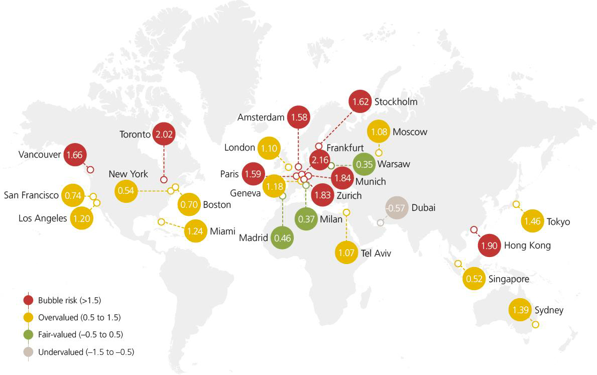 Francoforte, Toronto e Hong Kong sono in cima all’indice di quest’anno e rappresentano quindi le tre città con maggior rischio di bolla tra i mercati immobiliari analizzati. Il rischio è elevato anche a Monaco e Zurigo, mentre sia Vancouver che Stoccolma sono rientrate nella zona di rischio bolla. Amsterdam e Parigi completano la lista di città con un rischio di bolla. Tutte le città statunitensi valutate — Miami (che sostituisce Chicago nell’indice di quest’anno), Los Angeles, San Francisco, Boston e New York — si trovano in un territorio di sopravvalutazione. Gli squilibri nel mercato immobiliare sono elevati anche a Tokyo, Sydney, Ginevra, Londra, Mosca, Tel Aviv e Singapore, mentre Madrid, Milano e Varsavia presentano ancora valutazioni eque. Dubai è l’unico mercato sottovalutato e l’unica città classificata in una categoria inferiore rispetto allo scorso anno.