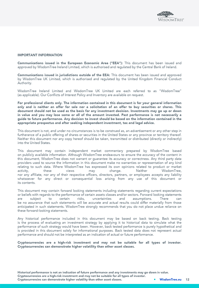 L’area ad accesso limitato è riservata ai clienti professionali. Le informazioni contenute nell’area ad accesso limitato non sono destinate a persone che si trovano negli Stati Uniti d’America e non devono essere da essi utilizzate. Accedendo all’area ad accesso limitato l’utente conferma di essere un cliente professionale ai sensi dell’Allegato II alla Direttiva 2014/65/UE del Parlamento europeo e del Consiglio del 15 maggio 2014 relativa ai mercati degli strumenti finanziari. Accedendo all’area ad accesso limitato l’utente conferma di essere d’accordo con la politica dei cookie. Se non si è d’accordo con queste condizioni non accedere al sito né alle eventuali pagine collegate. Questa area, al'interno del sito Web LMF Lamiafinanza, e il relativo contenuto sono stati forniti da WisdomTree UK Ltd autorizzata e disciplinata dalla FCA (Financial Conduct Authority) e da WisdomTree Ireland Ltd, autorizzata e disciplinata dalla Banca Centrale d’Irlanda (CBI) (insieme, “WisdomTree”). Il prezzo di qualsiasi azione o il valore di un investimento in Exchange-Traded Product (ETP) potrebbe fluttuare verso l'alto o verso il basso e un investitore potrebbe non recuperare la somma investita. Le precedenti performance non sono indicatori affidabili di quelle future. Questo materiale non deve essere inteso come una previsione, una ricerca o una consulenza in materia di investimento e non è un consiglio, né un'offerta o un invito ad acquistare o a vendere prodotti o strumenti finanziari o ad adottare qualsiasi strategia di investimento. Fare clic qui per leggere l'Esclusione di responsabilità completa.