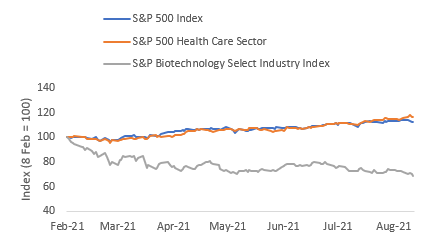 Senza dubbio, nel 2021 i titoli Biotech a piccola e media capitalizzazione hanno sperimentato la maggiore divergenza di performance e sono stati probabilmente i più colpiti dagli scossoni normativi e politici e dal COVID. Dall’inizio di febbraio alla metà di agosto del 2021, l’indice S&P Biotechnology Select Industry è sceso del 31,8% e ha sottoperformato sia l’S&P 500 che l’S&P 500 Health Care Sector con i margini più ampi di sempre (Figura 1).