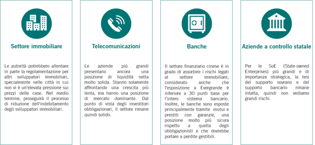 Per quanto riguarda il settore immobiliare, invece, va precisato innanzitutto che il controllo normativo in questo ambito non è una novità. Detto questo, il caso Evergrande (sviluppatore immobiliare) sta catalizzando l’attenzione degli investitori, influendo per lunghi tratti sull’andamento dell’intero mercato delle obbligazioni cinesi offshore (in USD) e, in particolare, su quello degli emittenti high yield del settore immobiliare. Chiaramente, la situazione è ancora in evoluzione e verosimilmente l’intervento governativo sarà dirimente. A nostro avviso, un’eventuale ristrutturazione del debito avverrà in modo più ordinato rispetto al passato, in quanto le autorità hanno accumulato più esperienza nella risoluzione di problemi di questo genere e considerato anche che l’intervento nel settore immobiliare è iniziato nel 2018. Inoltre, i mercati finanziari, in particolare gli investitori nelle obbligazioni cinesi, sono più preparati rispetto all’inaspettato default di Yongmei dello scorso anno. Pertanto, prevediamo che l’effetto di ricaduta su altri settori a causa del panico degli investitori sia gestibile, vista anche la volontà delle autorità di evitare il rischio sistematico, con la banca centrale che sarà pronta a intervenire per calmare il mercato se necessario.