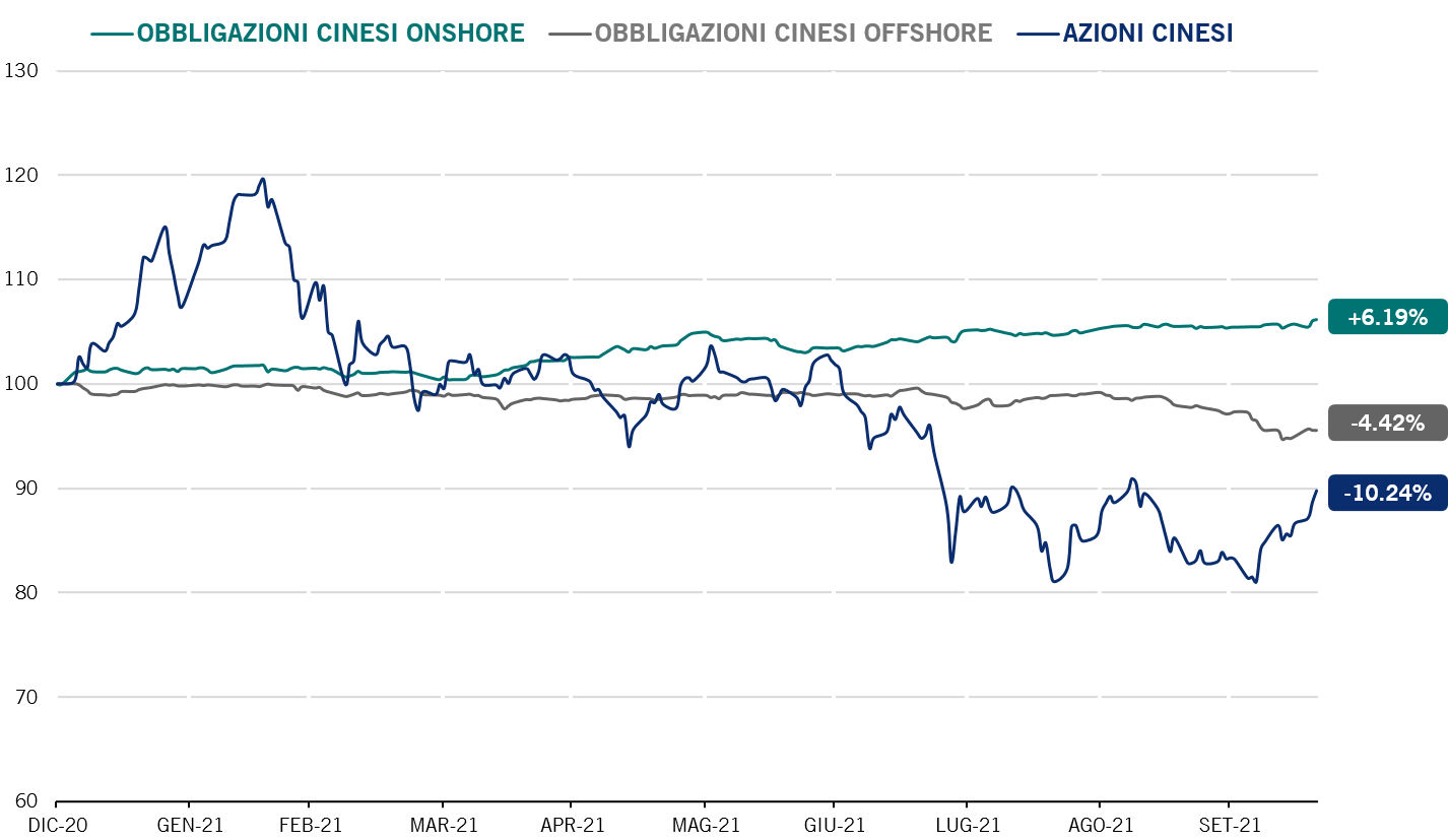 Fonte: Bloomberg, Pictet Asset Management, dati al 21.10.2021 relative agli indici Bloomberg China Aggregate, Bloomberg EM USD Aggregate – China, MSCI China (dati total return in USD).