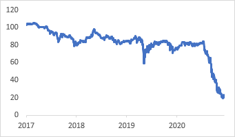 Il declino di Evergrande è stato impressionante, come mostra il grafico di seguito: uno o due anni fa, l’idea che una società di sviluppo immobiliare cinese così grande andasse in default, con un debito di oltre 300 miliardi di dollari, sarebbe sembrata, se non impossibile, piuttosto improbabile. Come vediamo questa situazione, e cosa significa per il resto della Cina, l’Asia e il resto del debito dei mercati emergenti?