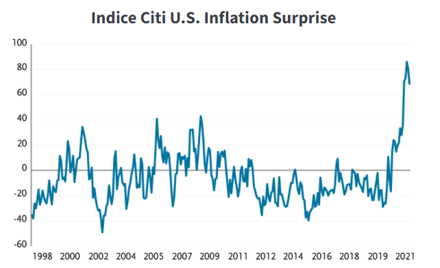 Se questa tesi è corretta, allora la questione sulla transitorietà dell’attuale rialzo inflazionistico potrebbe benissimo dipendere da quanto transitorio sarà l’intervento dello Stato a seguito della pandemia. Le metriche convenzionali dell’inflazione indicano già un tasso superiore al 5%, e il Citi U.S. Inflation Surprise Index segnala che le condizioni inflazionistiche stanno peggiorando a un tasso superiore a quello previsto da investitori ed esperti.