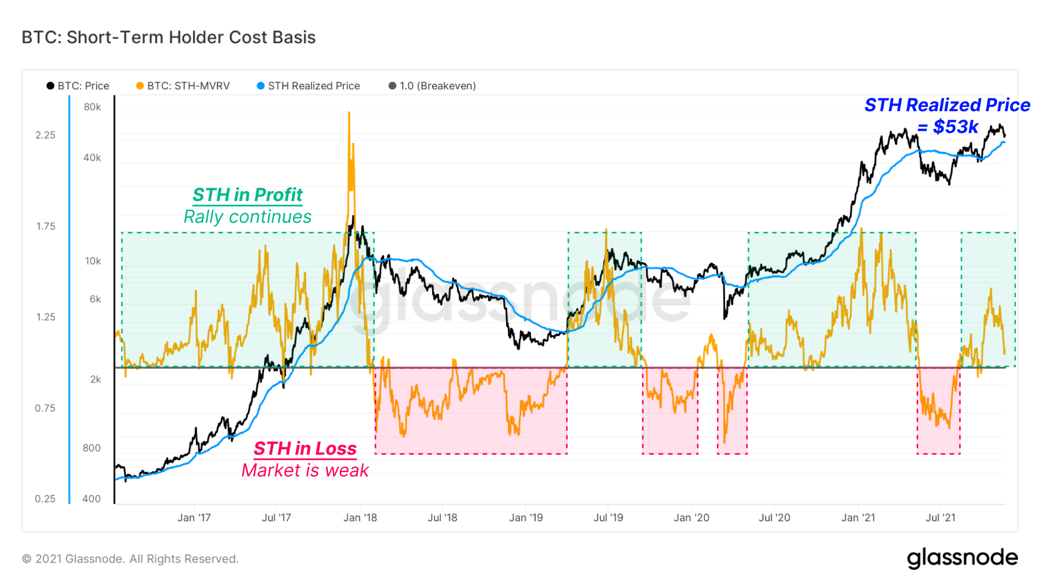 Nell’ultima settimana, il mercato delle criptovalute ha subito una brusca correzione, cedendo circa il 10% del suo valore. Ne è conseguito che anche il rendimento del Bitcoin è crollato, avendo perso il 15% nello stesso arco temporale. Una delle ragioni alla base di questo improvviso downturn sembra essere la possibilità di una messa al bando delle attività di mining in tutta l’Unione Europea, portata avanti da alcuni politici svedesi e norvegesi, e se questa posizione dovesse essere condivisa anche da altre nazioni dell’UE, si potrebbero vedere delle spinte al ribasso di breve periodo sull’asset digitale. Al valore attuale, lo “Short-Term Holder Cost Basis” indica che il valore realizzato della criptovaluta è di 53mila dollari (come si evince dal grafico sottostante); questo significa che qualsiasi scostamento del prezzo verso questa soglia potrebbe comportare una perdita per chi è entrato da poco nel mercato, ovvero per la maggioranza di coloro che causano le ondate di vendite.