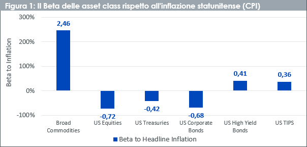 Quando si tratta di attività che possono coprire contro l’inflazione, le materie prime si distinguono storicamente come vincitori. Questa asset class ha il beta dell’inflazione più forte di tutti gli asset che abbiamo analizzato. Batte le attività che si suppone siano strutturalmente legate all’inflazione, come i TIPS, i titoli del Tesoro USA protetti dall’inflazione.