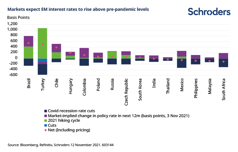 Solo nell’ultimo mese, le banche centrali di Brasile, Cile, Repubblica Ceca, Polonia e Russia hanno introdotto ampi rialzi dei tassi che hanno portato il consensus a dividersi. Nel frattempo, il mercato sta prezzando un irrigidimento ancora più sostanziale che porterebbe i tassi ai livelli pre-pandemici in molti Paesi emergenti.