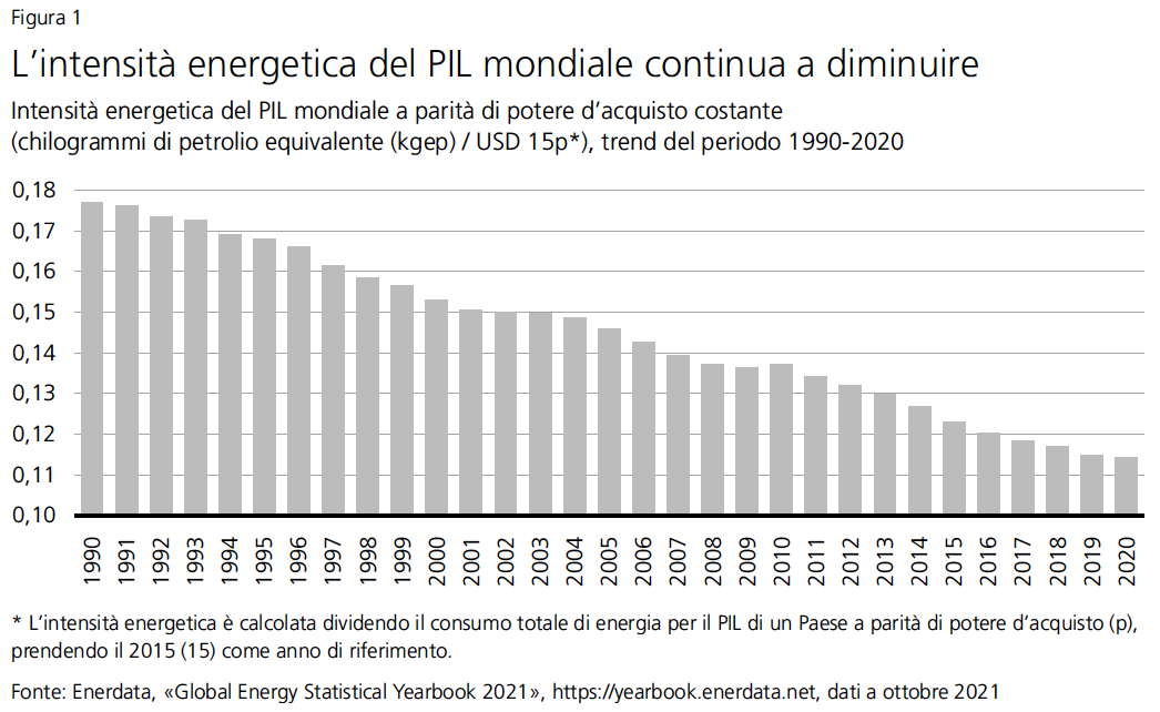 Ci aspettiamo che i prezzi dell’energia si stabilizzino, anche se su livelli più alti rispetto a prima della pandemia, nel contesto dell’accelerazione delle forniture e della ripresa delle scorte. La nuova capacità di produzione di gas e carbone dovrebbe spingere al ribasso i prezzi di queste materie prime a fronte del rallentamento della domanda fuori stagione o se l’inverno dovesse essere più mite del previsto nell’emisfero settentrionale. Nel complesso ci aspettiamo che il caro-energia abbia solo un impatto modesto sulla crescita e l’inflazione. L’intensità energetica del PIL mondiale è diminuita del 25% dal 1990 e di oltre il 50% dai primi anni ’70. Le nostre previsioni sono esposte al rischio che l’inverno sia particolarmente rigido o che l’OPEC operi ulteriori tagli alla produzione, con conseguenti nuovi aumenti dei prezzi dell’energia nell’anno in corso.